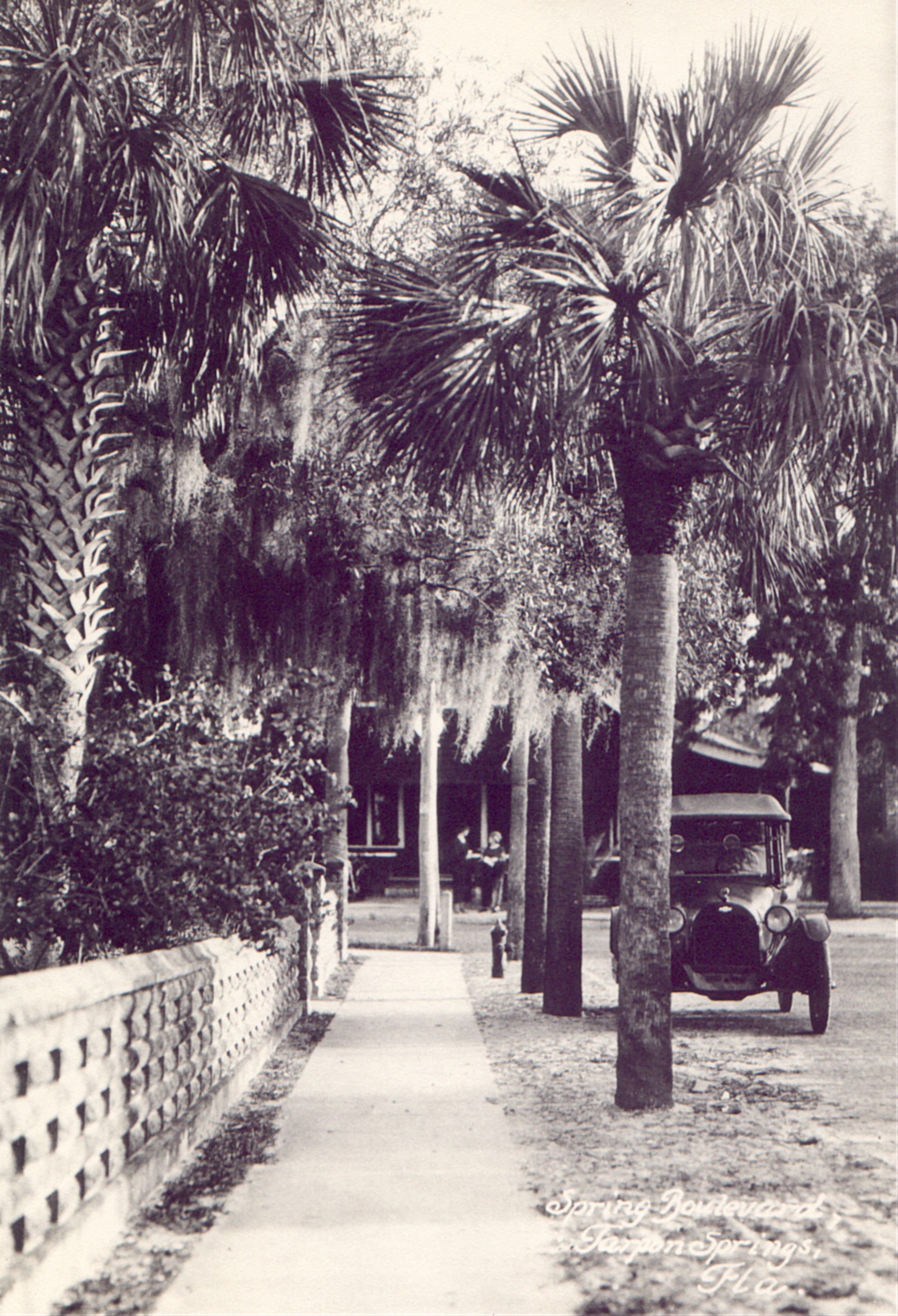 The city acquired a new look in the decade before WWI. ........Spring Boulevard - c 1920sThe Tarpon Springs High School was built in 1912, the waterworks was constructed in 1914, and the impressive new City Hall opened its doors in 1915. By 1910 Tarpon Springs included an ice plant, an electric plant, two lumber mills, cigar factories, several banks and a post office. Tarpon Springs experienced the real estate boom and increase in tourism that characterized Florida during the 1920s. Many new subdivisions were laid out, tripling the area of the original town, and a number of impressive buildings were constructed, including the Sunset Hills Country Club, Arcade Hotel, Villa Plumosa, a new high school, an amusement pier, a water plant,